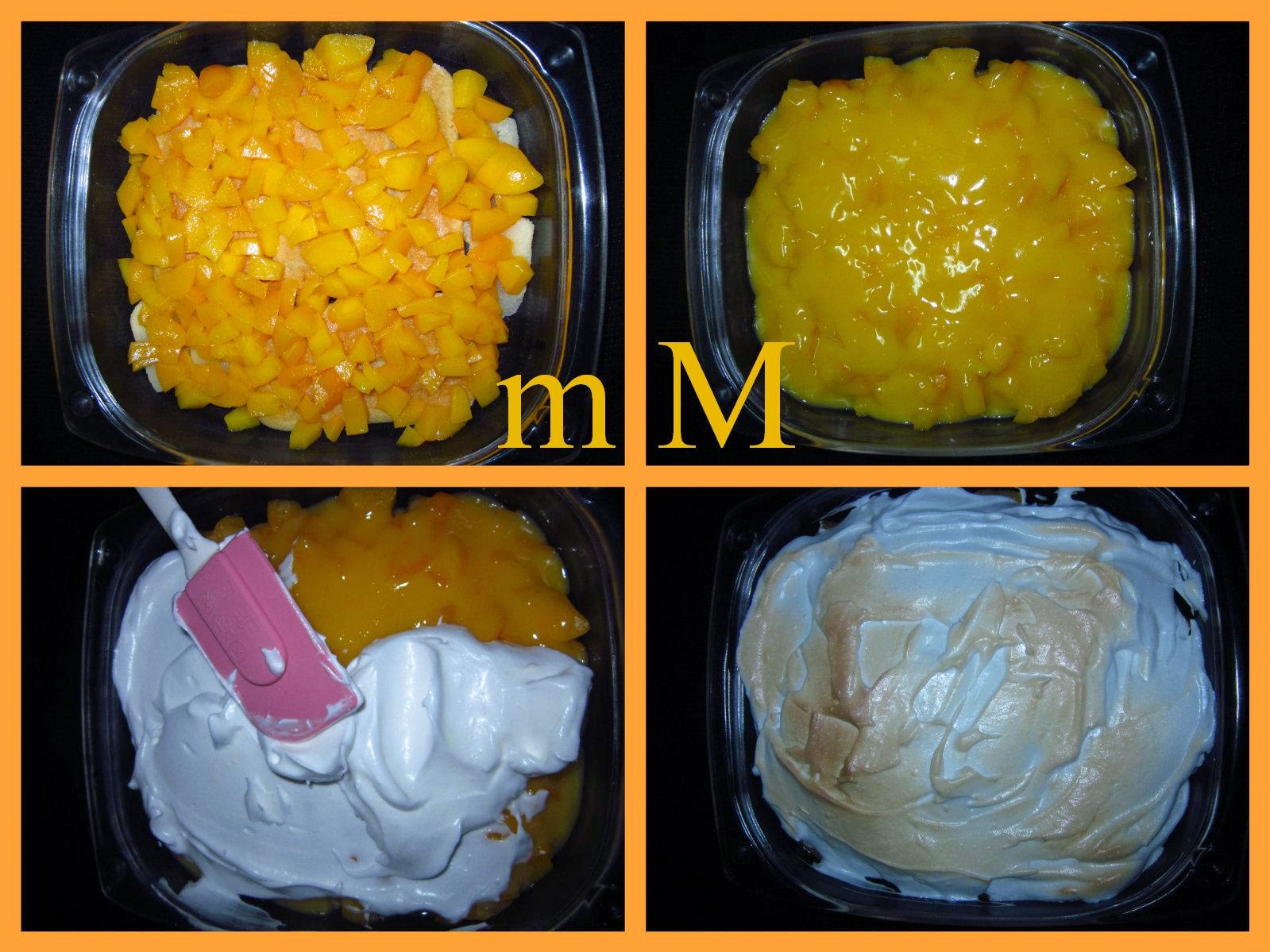 Se cubre el fondo de un molde (en el que se va a presentar) con los bizcochos. Se riegan con el almíbar del melocotón. Lo melocotones se pican en daditos y se esparcen por encima, extendidos regularmente.